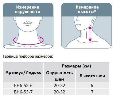 Для корректного подбора бандажа для шеи для детей старше 1 года необходимо измерить сантиметровой лентой два параметра: окружность и высоту шеи. Первый параметр измеряется по длине окружности шеи у ее основания. Для определения второго параметра необходимо в вертикальном положении головы измерить расстояние от угла нижней челюсти до ключицы. В соответствии с размерными таблицами подбирается нужный артикул (размер) бандажа для шеи. Как подобрать размер смотрите в инструкции и на фотографии сверху.