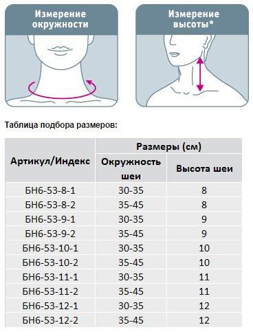Для корректного подбора бандажа для шеи необходимо измерить сантиметровой лентой два параметра: окружность и высоту шеи. Первый параметр измеряется по длине окружности шеи у ее основания. Для определения второго параметра необходимо в вертикальном положении головы измерить расстояние от угла нижней челюсти до ключицы. В соответствии с размерными таблицами подбирается нужный артикул (размер) бандажа.