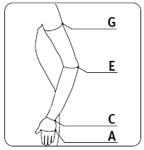 Измерения проводят на выпрямленной руке. Окружности руки следует измерять от уровня ладони (А) до уровня (G), расположенного на 3 см ниже подмышки. При измерении окружностей следите за тем, чтобы измерительная лента плотно прилегала к коже руки, но не врезалась в нее.